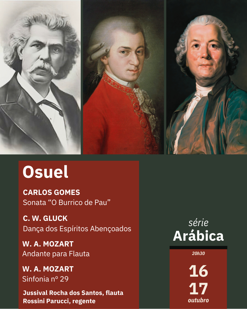 Na sequência, o solista Jussival Rocha dos Santos, flautista da OSUEL, executará duas obras lindíssimas: primeiro, a Dança dos Espíritos Abençoados de Christoph Willibald Gluck e, depois, o Andante para Flauta de Wolfgang A. Mozart.